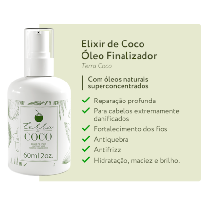 Uma única aplicação do Elixir de Coco recupera os cabelos extremamente danificados, acentua cachos, mechas e penteados, com seu toque seco, doando intenso brilho e sedosidade.