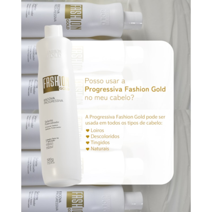 A fórmula exclusiva da Fashion Gold foi desenvolvida para alisar os seus cabelos desde a primeira aplicação, mantendo-os resistentes e saudáveis, com o ativo exclusivo Kerafive22® e ingredientes de alta qualidade, como a proteína de quinoa, o óleo Inca e o óleo de coco, que nutrem profundamente seus fios, reduzindo a quebra e o frizz, deixando seus cabelos brilhantes e macios.