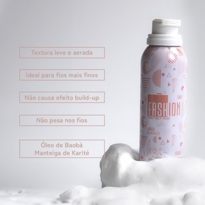 O primeiro passo do ritual é o Protect Poo Mousse, que prepara os fios antes da lavagem com uma textura leve e aerada. Ele cria uma barreira protetora que impede que os tensoativos do shampoo entrem em contato direto com a cutícula, evitando danos e mantendo a hidratação natural.