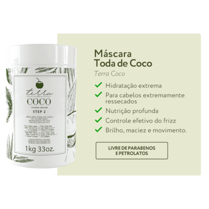 Máscara toda de Coco é desenvolvida com base em todas as partes do coco, como casca, polpa, água, leite, óleo, manteiga, soro, cera e coco ralado, com o objetivo de acabar de vez com o ressecamento excessivo.